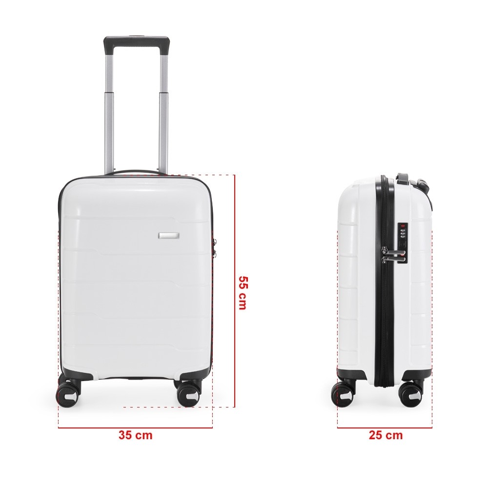 Mala de bordo 45 litros em plástico PP (casca dura), contém cadeado numérico TSA. Compartimentos com bolso telado e cinta compressora para roupas. A mala possui duas alças de mão, puxador retrátil com regulagem de tamanho, quatro rodinhas 360º e apoios laterais. Acompanha placa para personalização.