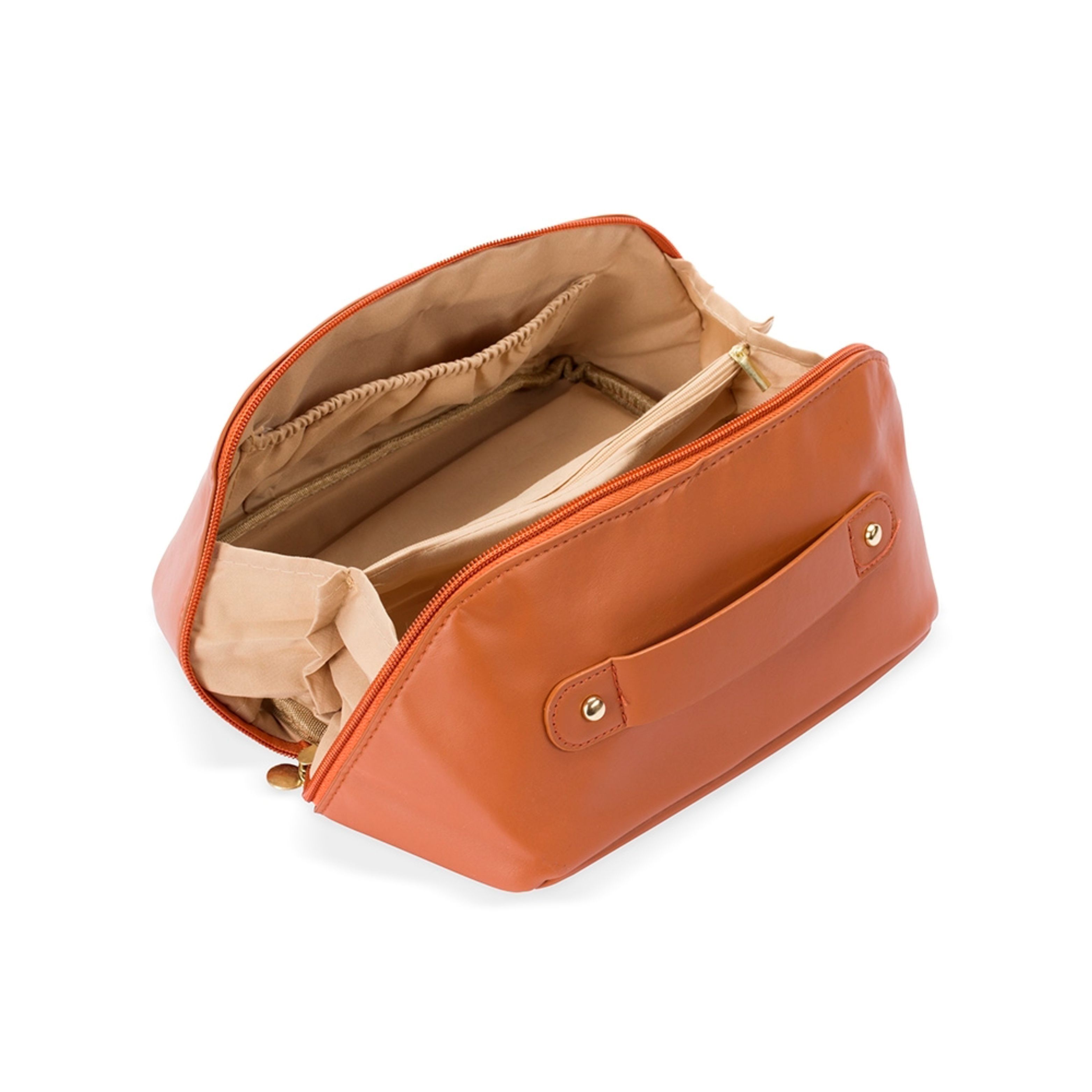 Nécessaire confeccionado em poliuretano (PU) impermeável com abertura em 180 graus que remete ao formato de uma concha. Possui amplo compartimento interno com dois bolsos laterais abertos e um central com fechamento em zíper. Contém uma alça para transporte.